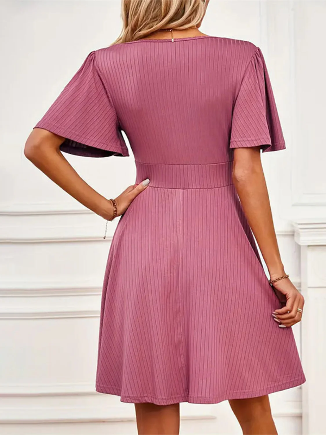 Introducing our Surplice Flutter Sleeve Mini Dress, the perfect addition to your wardrobe for any occasion.