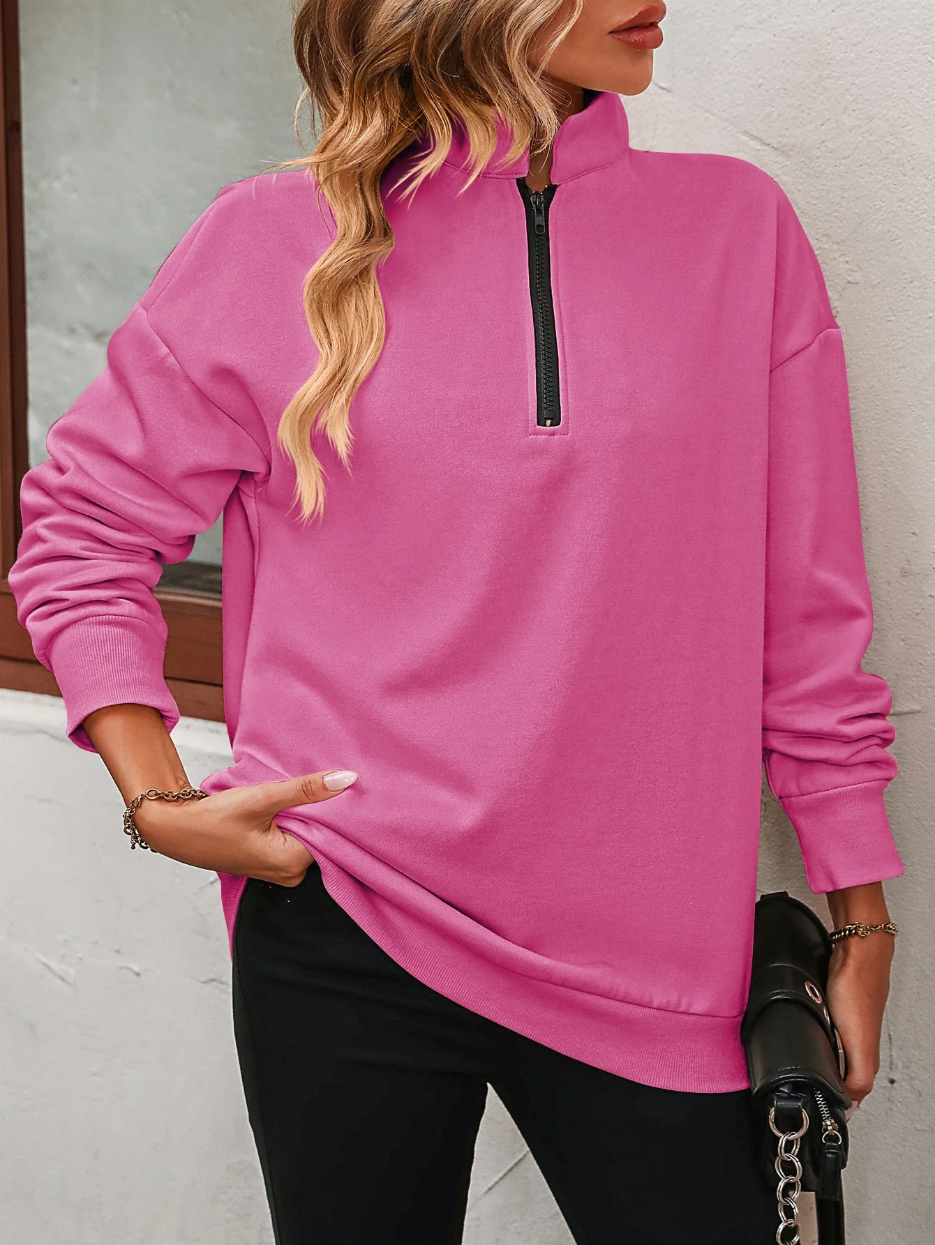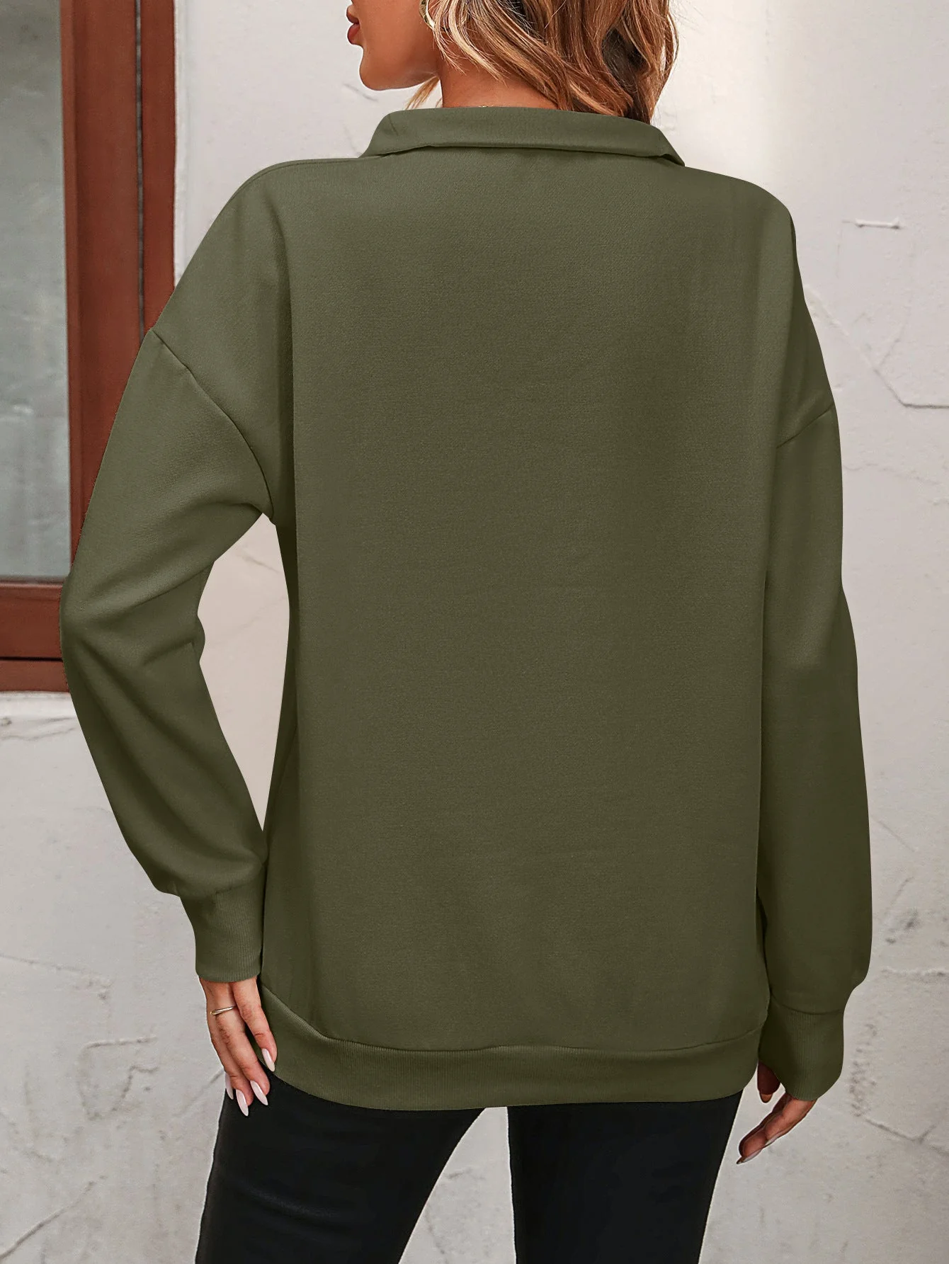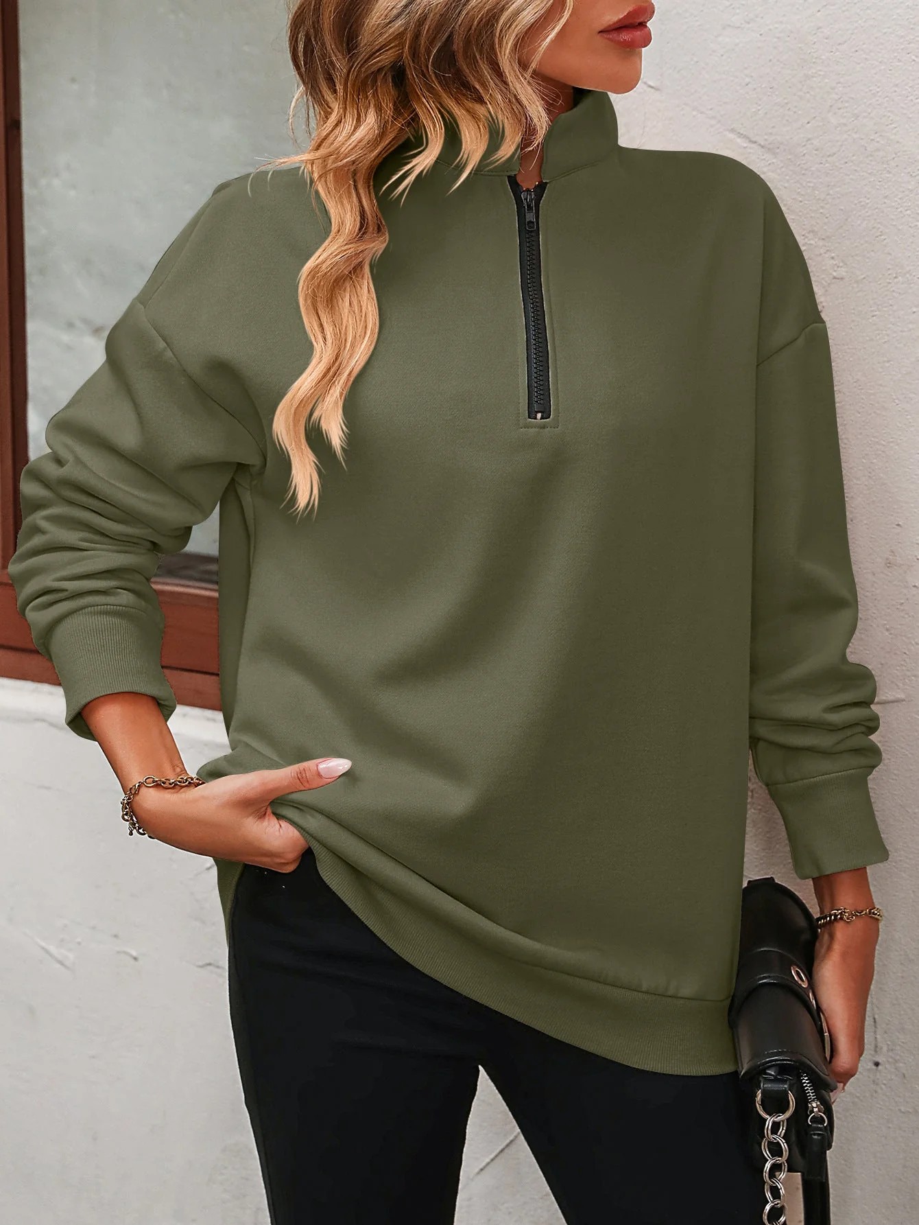 This Zip-Up Dropped Shoulder Sweatshirt is a casual style staple with a solid pattern. It features a zipper and a collared neck, making it a versatile addition to your wardrobe. The sweatshirt is long in length with long sleeves that have a dropped shoulder design.
